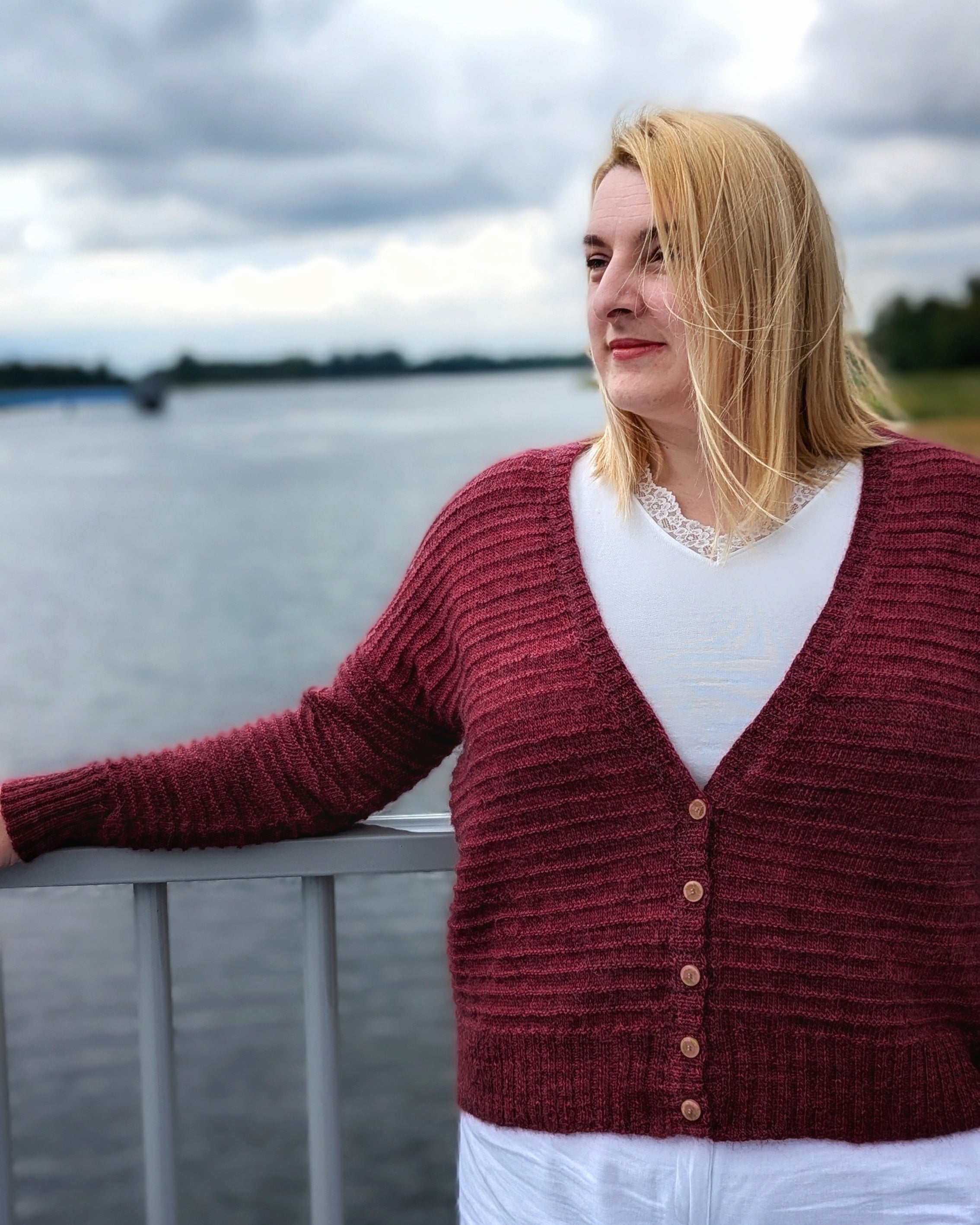 The cardigan was designed to be worn with approximately 10-15 cm / 4–6 ” of positive ease at bust.