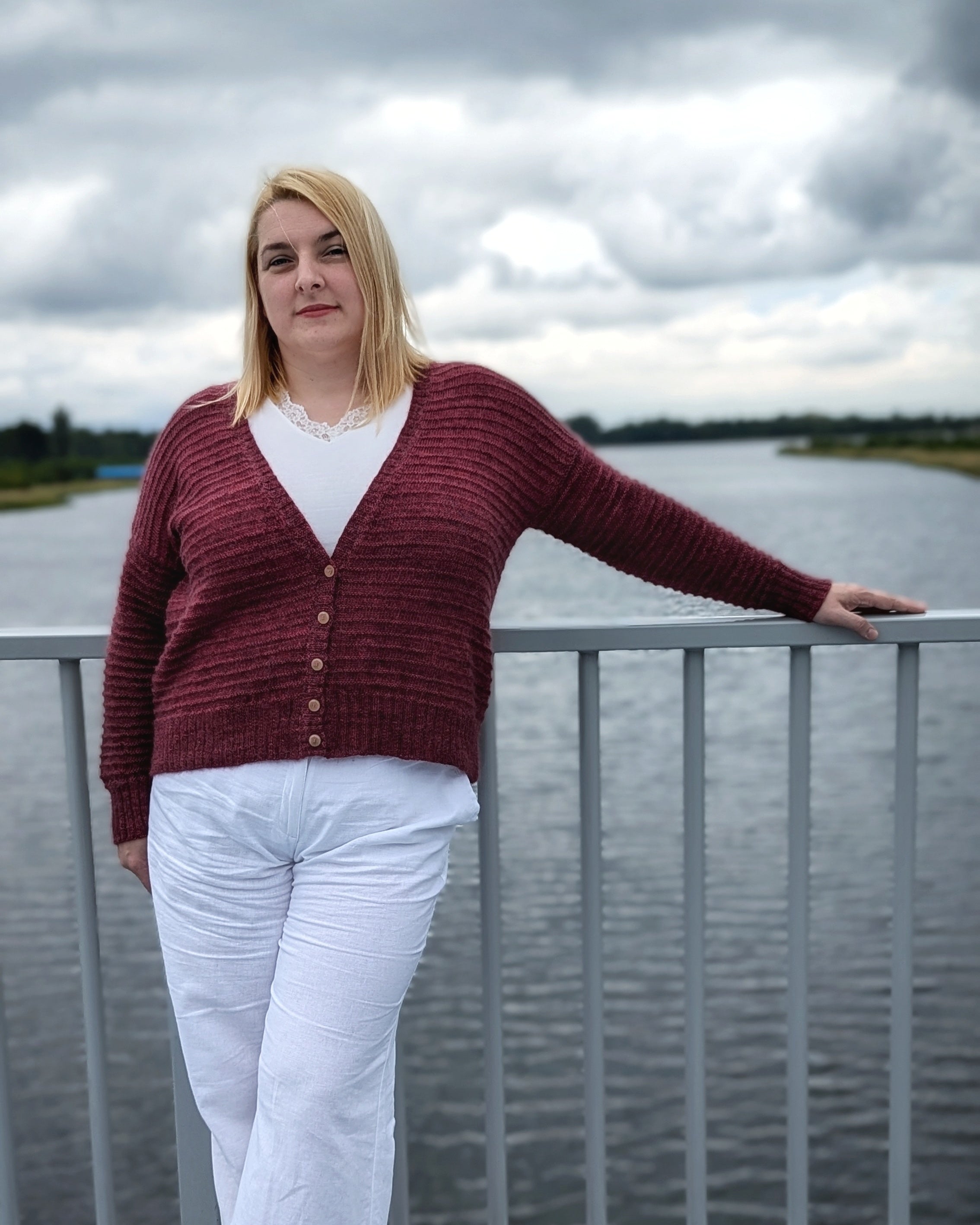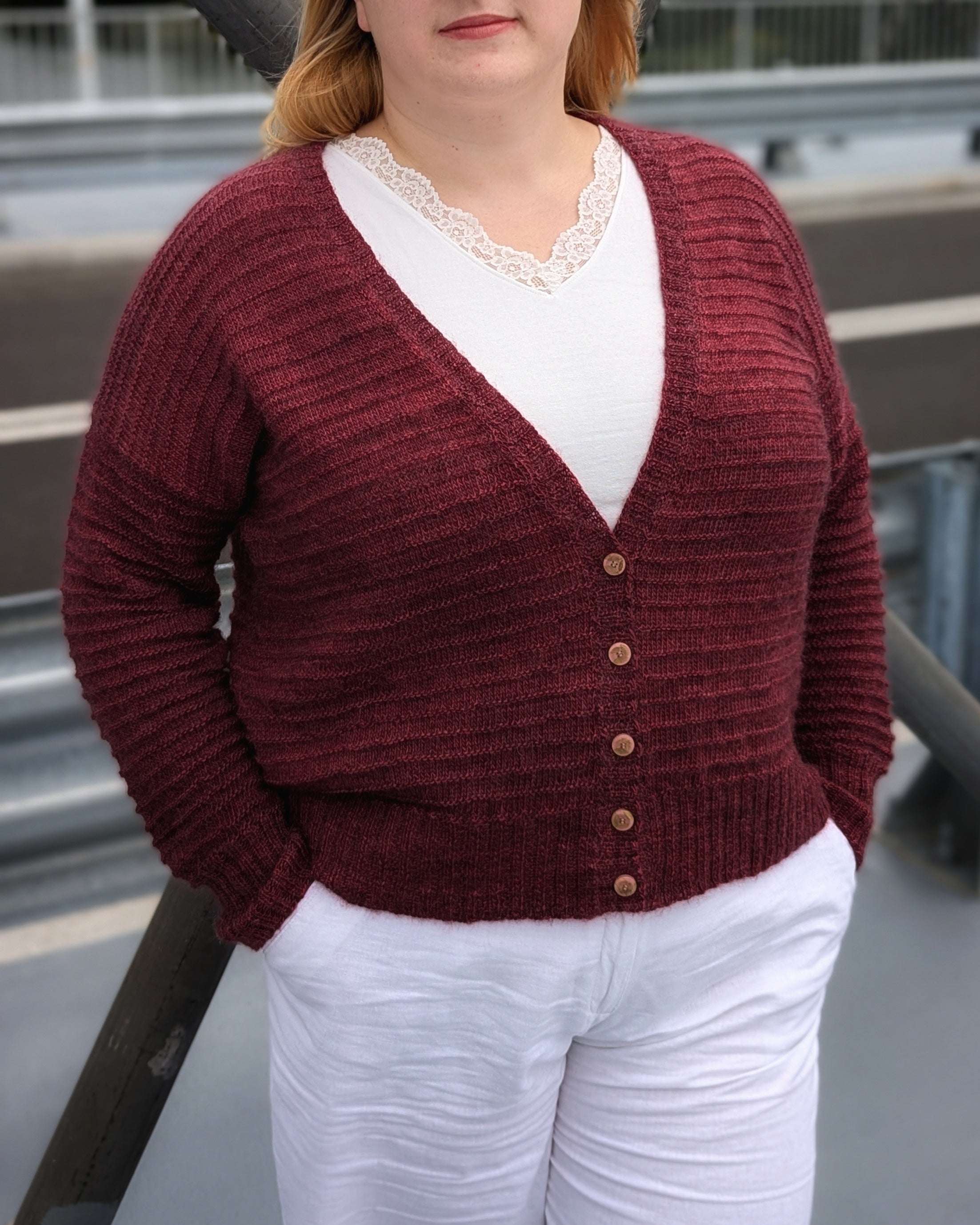 Fluffygan is a basic and lightweight cardigan with drop shoulder sleeves and all over Purl Ridge stitch pattern, designed to be worn with positive ease at bust. It is knit back and forth from top down.
