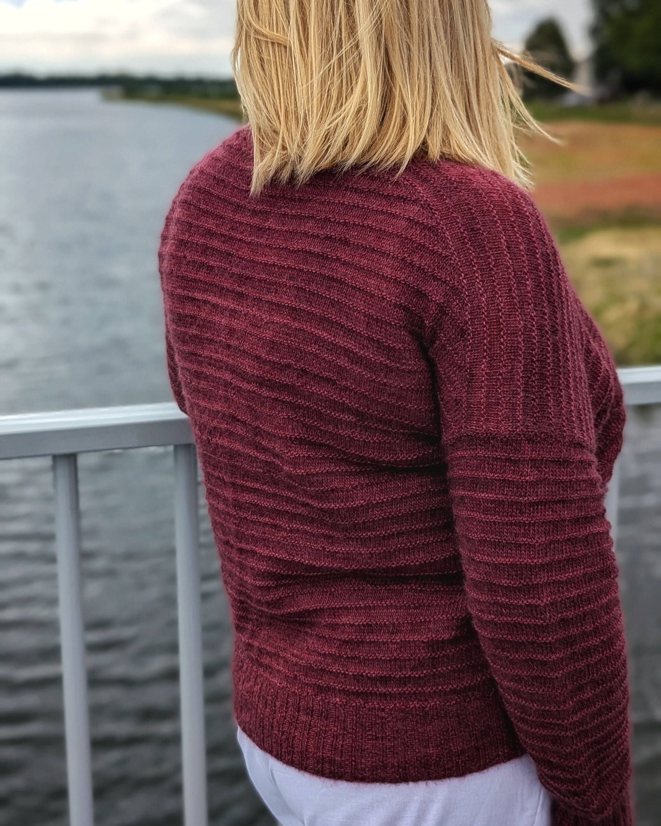 The upper back is worked first and, at the same time, shaped by Japanese short rows. The fronts are worked next and shaped with increases. The upper back and upper fronts at the armpit level are joined into one piece and knit flat until the bottom rib. The cardigan's bottom rib and button band are made of 2x2 rib. The sleeves are knit in the round in all over Purl Ridge stitch pattern, as the body, and finished with matching 2x2 rib cuffs.